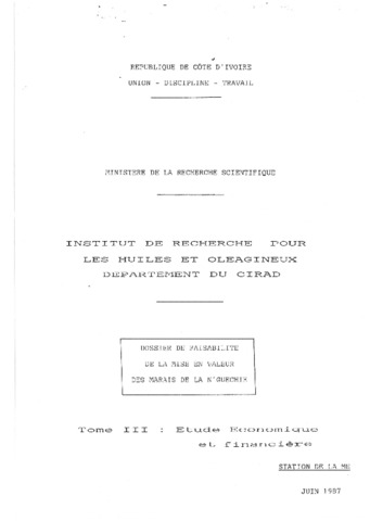 CIRAD-IRHO - FRA. 1987. Dossier de faisabilité de la mise en valeur des marais de la N'guéchié [Côte d'Ivoire]. Tome III : étude économique et financière. Paris : CIRAD-IRHO, 60 p.