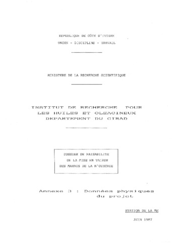 CIRAD-IRHO - FRA. 1987. Dossier de faisabilité de la mise en valeur des marais de la N'guéchié [Côte d'Ivoire]. Annexe 3 : données physiques du projet. Paris : CIRAD-IRHO, 31 p.