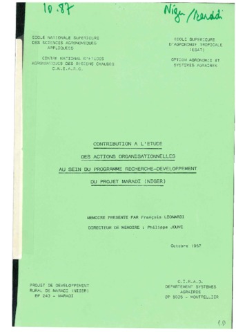 Léonardi François. 1987. Contribution à l'étude des actions organisationnelles au sein ou programme recherche-développement ou projet Maradi (Niger). Montpellier : CNEARC-ESAT, 87 p. Mémoire de fin d'étude : Agronomie tropicale, option Agronomie et systèmes agraires : Centre national d'études agronomiques des régions chaudes