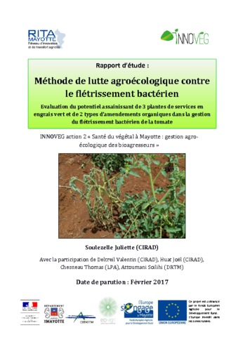 Soulezelle Juliette, Deltreil Valentin, Huat Joël, Chesneau Thomas, Attoumani Soilihi. 2017. Rapport d'étude : Méthode de lutte agroécologique contre le flétrissement bactérien. Evaluation du potentiel assainissant de 3 plantes de services en engrais vert et de 2 types d'amendements organiques dans la gestion du flétrissement bactérien de la tomate. Mamoudzou : RITA, 24 p.