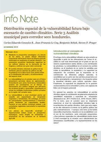 Gonzalez R Carlos Eduardo, Le Coq Jean-François, Schiek Benjamin, Prager Steven D.. 2019. Distribución espacial de la vulnerabilidad futura bajo escenario de cambio climático. Serie 3 Análisis municipal para corredor seco hondureño. Rome : CGIAR, 5 p. (CCAFS Info Note)