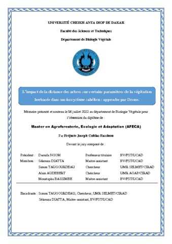 Fassinou Cofélas. 2022. L'impact de la distance des arbres sur certains paramètres de la végétation herbacée dans un écosystème sahélien : approche par Drone. Dakar : UCAD, 59 p. Mémoire de master 2 : Agroforesterie, écologie et adaptation (AFECA) : Université Cheikh Anta Diop