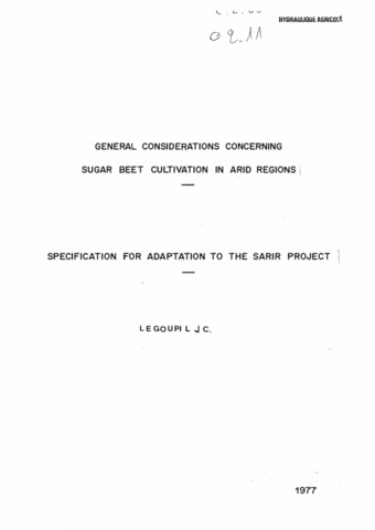 Le Goupil J.C.. 1977. General considerations concerning sugar beet cultivation in arid regions. Specification for adaptation to the Sarir project, according to Irat-Satec works and publications about sugar beet cultivation -in Mediterranean regions. Nogent-sur-Marne : GERDAT, 23 p.