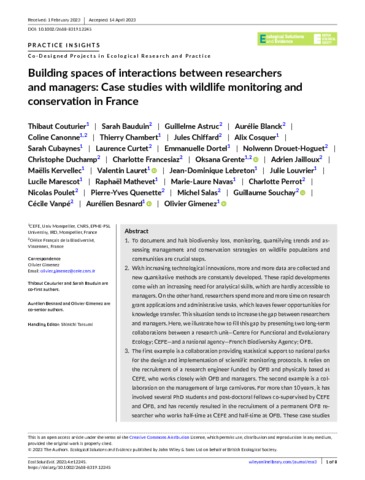 Couturier Thibaut, Bauduin Sarah, Astruc Guillelme, Blanck Aurélie, Canonne Coline, Chambert Thierry, Chiffard Jules, Cosquer Alix, Cubaynes Sarah, Curtet Laurence, Dortel Emmanuelle, Drouet-Hoguet Nolwenn, Duchamp Christophe, Francesiaz Charlotte, Grente Oksana, Jailloux Adrien, Kervellec Maëlis, Lauret Valentin, Lebreton Jean Dominique, Louvrier Julie, Marescot Lucile, Mathevet Raphaël, Navas Marie-Laure, Perrot Charlotte, Poulet Nicolas, Quenette Pierre--Yves, Salas Michel, Souchay Guillaume, Vanpé Cécile, Besnard Aurélien, Gimenez Olivier. 2023. Building spaces of interactions between researchers and managers: Case studies with wildlife monitoring and conservation in France. Ecological Solutions and Evidence, 4 (2):e12245, 8 p.