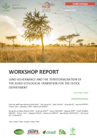 Sourisseau Jean-Michel, Ka Dié-Yacine, Piraux Marc, Bayo Finda, Milhorance Carolina, Sall Thierno, Sow Mamadou, Ndour Maimouna, Sene Mame Birame, Diouf Ibrahima, Senghor Abdu, Diop Babacar, Sambou Bodian Chérif, Ndiaye Alassane. 2023. Workshop report. Land governance and the territorialisation of the agro-ecological transition for the Fatick Department. Montpellier : DyTAES-CIRAD-ISRA, 40 p.