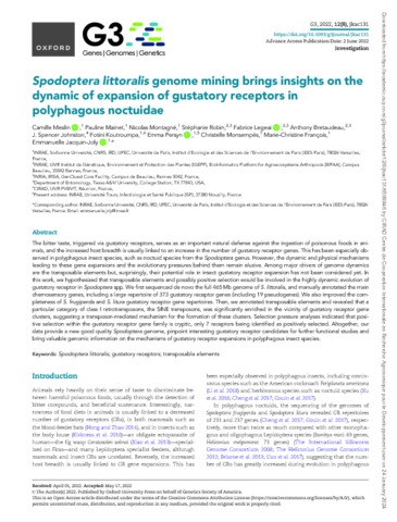 Meslin Camille, Mainet Pauline, Montagné Nicolas, Robin Stéphanie, Legeai Fabrice, Bretaudeau Anthony, Johnston J Spencer, Koutroumpa Fotini, Persyn Emma, Monsempès Christelle, François Marie-Christine, Jacquin-Jolyb Emmanuelle. 2022. Spodoptera littoralis genome mining brings insights on the dynamic of expansion of gustatory receptors in polyphagous noctuidae. G3 - Genes Genomes Genetics, 12 (8):jkac131, 12 p.