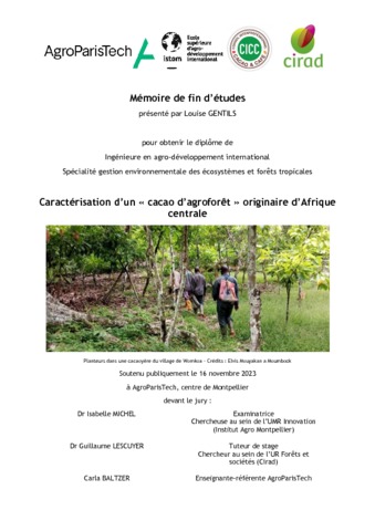 Gentils Louise. 2023. Caractérisation d'un "cacao d'agroforêt" originaire d'Afrique centrale. Montpellier : AgroParisTech, 112 p. Mémoire d'ingénieur : Agro-développement international. Gestion environnementale des ecosystèmes et forêts tropicales : AgroParisTech