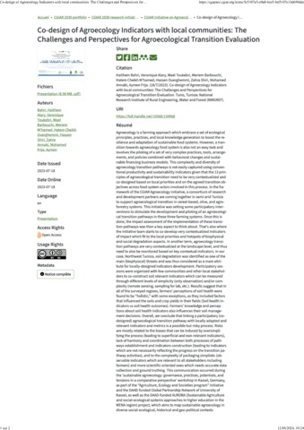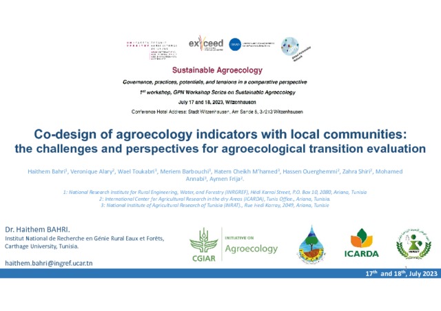 Résumé : Agroecology is a farming approach which embrace a set of ecological principles, practices, and local knowledge generation to boost the resilience and adaptation of sustainable food systems. However, a transition towards agroecology food system is also not an easy task and involves the piloting of a set of very complex practices, tools, arrangements, and policies combined with behavioral changes and sustainable financing business models. This complexity and diversity of agroecology transition pathways is not easily captured using conventional productivity and sustainability indicators given that the 13 principles of agroecological transition need to be very contextualized and co-designed based on local priorities and on the agreed transition objectives across food system actors involved in this process. In the framework of the CGIAR Agroecology initiative, a consortium of research and development partners are coming together in semi-arid Tunisia to support agroecological transition in cereal-based, olive, and agroforestry systems. This initiative was setting some participatory interventions to stimulate the development and piloting of an agroecological transition pathways in these three farming systems. Once this is done, the impact assessment of the implementation of these transition pathways was then a key aspect to think about. That's also where the initiative team starts to co-develop very contextualized indicators of impact which fit to the local priorities and hotspots of biophysical and social degradation aspects. In another term, agroecology transition pathways are very contextualized at the landscape level, and thus need to also be monitored based on key contextual indicators. In our case, Northwest Tunisia, soil degradation was identified as one of the main (biophysical) threats and was thus considered as a main attribute for locally-designed indicators development. Participatory sessions were organised with few communities and other local stakeholders to co-construct soil relevant indicators which can be measured through different levels of simplicity (only observation) and/or complexity (remote sensing, sampling for lab, etc.). Results suggest that in all of the surveyed regions, farmers' perceptions of soil health were found to be "holistic," with some exceptions, as they included factors that influenced the soils and crop yields in their fields (Soil health indicators vs soil health outcomes). Farmers' knowledge and perceptions about soil health indicators also influences their soil management decisions. Overall, we conclude that linking a participatory (co-designed) agroecological transition pathway with locally adapted and relevant indicators and metrics is a possible but risky process. Risks are mostly related to the biases that can be induced by oversimplifying the process (leading to superficial and non-relevant indicators), lack of harmony and coordination between both processes of pathways establishment and indicators construction (leading to indicators which are not necessarily reflecting the progress on the transition pathway activities), and to the complexity of packaging simplistic (observable indicators which are relevant to all stakeholders including farmers) and more scientific-oriented ones which needs accurate data collection and ground truthing. This communication occurred during the 'sustainable agroecology: governance, practices, potentials, and tensions in a comparative perspective' workshop in Kassel, Germany, as part of the “Agriculture, Ecology and Societies program” initiative and the DAAD-funded Global Partnership Network of University of Kassel, as well as the DAAD-funded AURORA (Sustainable Agriculture and social-ecological systems approaches in higher education in the MENA region) project, which aims to map sustainable agroecology in diverse social-ecological, historical and geo-political contexts (University of Kassel – 17-18 July 2023).