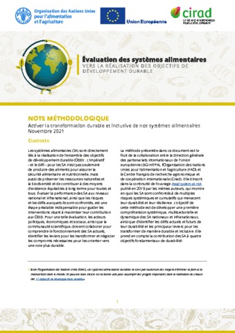 Sirdey Ninon, David-Benz Hélène, Deshons Alice, Orbell Claire, Lourme-Ruiz Alissia, Herlant Patrick, Punjabi Meeta, Avella Nicoletta, Magada Dominique. 2021. Evaluation des systèmes alimentaires vers la réalisation des objectifs de développement durable. Note Méthodologique. Rome : FAO, 8 p.