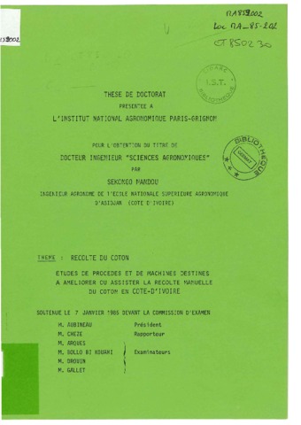 Sékongo Nandou. 1985. Études de procédés et de machines destinés à améliorer ou assister la récolte manuelle du coton en Côte-d'Ivoire. Paris : INAPG, 199 p. Thèse de docteur-ingénieur : Sciences Agronomiques : Institut national agronomique Paris-Grignon ; Centre de coopération internationale en recherche agronomique pour le développement