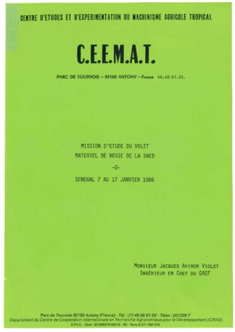Violet Jacques Aviron. 1986. Mission d'étude du volet matériel de régie de la Saed. Sénégal 7 au 17 janvier 1986. Antony : CIRAD, 68 p.