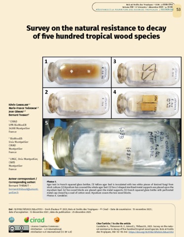 Candelier Kévin, Gerard Jean, Thévenon Marie-France, Thibaut Bernard. 2023. Survey on the natural resistance to decay of five hundred tropical wood species. Bois et Forêts des Tropiques, 358 : 53-65.