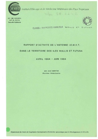 Bertin J.. 1985. Rapport d'activité de l'antenne IEMVT dans le territoire des iles Wallis et Futuna. Avril 1984-juin 1985. Nouméa : CIRAD, 79 p.