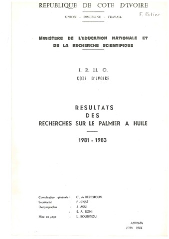 De Berchoux C.. 1984. Résultats des recherches sur le palmier à huile 1981-1983. Abidjan : GERDAT, 316 p.