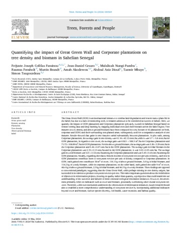 Cofélas Fassinou Fréjuste Joseph, Cesaro Jean-Daniel, Nungi-Pambu Maïalicah, Fensholt Rasmus, Brandt Martin, Akodewou Amah, Diouf Abdoul Aziz, Mbaye Tamsir, Taugourdeau Simon. 2024. Quantifying the impact of Great Green Wall and Corporate plantations on tree density and biomass in Sahelian Senegal. Trees, Forests and People, 16:100569, 13 p.