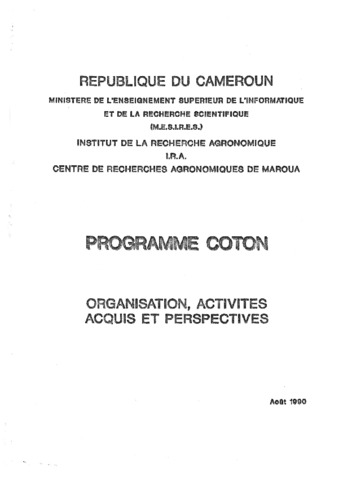 CIRAD-IRCT - FRA, IRA - CMR. 1990. Programme coton : organisation, activités acquis et perspectives. Maroua : IRA, 50 p.