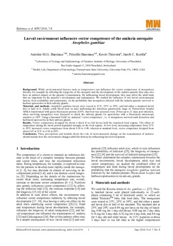 Barreaux Antoine, Barreaux Priscille, Thievent Kevin, Koella Jacob C.. 2016. Larval environment influences vector competence of the malaria mosquito Anopheles gambiae. MalariaWorld Journal, 7 (8), 6 p.