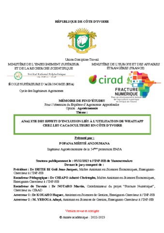 Utilisation soumise à autorisation de l'auteur ou du Cirad. Analyse des effets d'inclusion liés à l'utilisation de whatsapp chez les cacaoculteurs en Côte d'Ivoire.pdf Télécharger (2MB) | Prévisualisation |