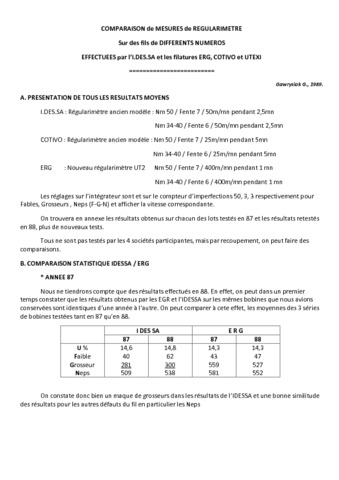Gawrysiak Gérard. 1989. Comparaison de mesures de régularimètre sur des fils de différents numéros effectuées par l'I.DES.SA et les filatures ERG, COTIVO et UTEXI. s.l. : s.n., 5 p.