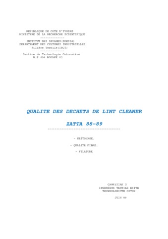 Gawrysiak Gérard. 1989. Qualité des déchets de lint cleaner. Zatta 88-89. Nettoyage. Qualité fibre. Filature. Bouaké : IDESSA, 4 p.