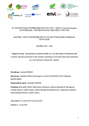 Perron Antonin. 2024. Surveillance aux points d'entrée vis-à-vis des risques d'introduction des maladies animales prioritaires et des maladies zoonotiques et inventaire des tiques introduites par voie maritime en Union des Comores. Toulouse : ENVT, 59 p. Mémoire de master 2 : Gestion intégrée des zoonoses et maladies animales tropicales : Ecole Nationale Vétérinaire de Toulouse