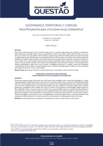 Piraux Marc. 2024. Governança territorial e comuns: Nova perspectiva para uma governança colaborativa. Desenvolvimento Em Questão, 22 (61), n.spéc. Abordagem territorial do desenvolvimento: gênesis, base epistêmica e enfoques teórico-metodológicos convergentes, 20 p.