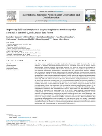 Guzinski Radoslaw, Nieto Héctor, Ramo Sánchez Rubén, Sánchez Juan Manuel, Jomaa Ihab, Zitouna-Chebbi Rim, Roupsard Olivier, López-Urrea Ramón. 2023. Improving field-scale crop actual evapotranspiration monitoring with Sentinel-3, Sentinel-2, and Landsat data fusion. International Journal of Applied Earth Observation and Geoinformation, 125:103587, 17 p.
