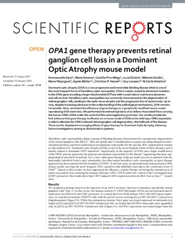 Sarzi Emmanuelle, Seveno Marie, Piro-Megy Camille, Elzière Lucie, Quilès Mélanie, Péquignot Marie, Müller Agnès, Hamel Christian P., Lenaers Guy, Delettre Cécile. 2018. OPA1 gene therapy prevents retinal ganglion cell loss in a Dominant Optic Atrophy mouse model. Scientific Reports, 8 (1):2468, 6 p.