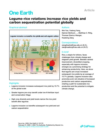 Yao Wei, Yang Yadong, Beillouin Damien, Zhao Jie, Olesen Jørgen Eivind, Zhou Jie, Smith Pete, Zeng Zhaohai, Lambers Hans, Rillig Matthias C., Wanger Thomas Cherico, Zang Huadong. 2025. Legume-rice rotations increase rice yields and carbon sequestration potential globally. One Earth, 8:101170, 10 p.