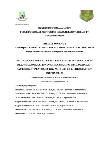 Andriamanga Andoniaina Valérie. 2024. De l'agriculture au bâti dans les plaines inondables de l'agglomeration d'Antananarivo (Madagascar) : facteurs et pratiques des acteurs de l'urbanisation informelle. Antananarivo : Université d'Antananarivo, 284 p. Thèse de doctorat : Gestion des ressources naturelles et développement : Université d'Antananarivo