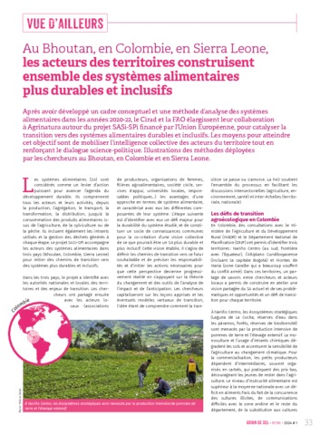 Dabat Marie-Hélène, Rodríguez-Borray Gonzalo-Alfredo, Vagneron Isabelle. 2024. Au Bhoutan, en Colombie, en Sierra Leone, les acteurs des territoires construisent ensemble des systèmes alimentaires plus durables et inclusifs. Grain de Sel (86) : 33-34.