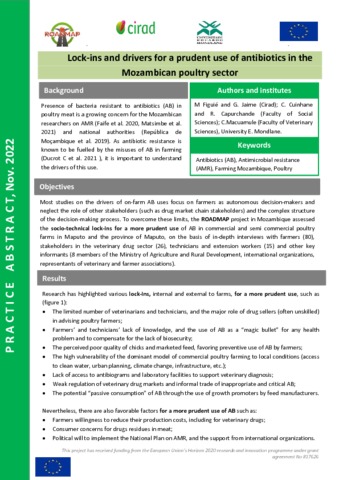 Figuié Muriel, Jaime Gloria, Cuinhane Carlos, Capurchande Rehana, Macuamule Cristiano. 2022. Lock-ins and drivers for a prudent use of antibiotics in the Mozambican poultry sector. Montpellier : CIRAD-Universidade Eduardo Mondlane, 2 p.