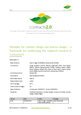 Prager Katrin, Dutilly Céline, Andersen Erling, Czajkowski Mikołaj, Defrijn Sven, García-Llorente Marina, Hamon Christine, Kelemen Eszter, Le Clech Solen, Turkelboom Francis, Rommel Jens, Udovč Andrej. 2022. Principles for contract design and process design – A framework for synthesising the empirical research in Contracts2.0. s.l. : s.n., 18 p.