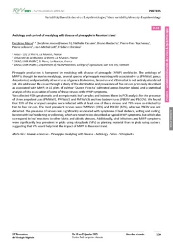 Résumé : Pineapple production is hampered by mealybug wilt disease of pineapple (MWP) worldwide. The aetiology of MWP is thought to involve mealybugs, several species of pineapple mealybug wilt-associated virus (PMWaV, genus Ampelovirus) and potentially other viruses of genera Badnavirus, Secovirus and Vitivirusbut is not entirely elucidated yet. We addressed this issue through a study of the distribution and prevalence of five viruses previously described as associated with MWP, in 15 plots of cultivar 'Queen Victoria' cultivated across Reunion Island, and a statistical analysis of the association of some of these viruses with MWP symptoms. We collected 450 symptomatic and asymptomatic leaf samples and indexed them by PCR analysis for the presence of three ampeloviruses (PMWaV1, PMWaV2 and PMWaV3) and two badnaviruses (PBERV and PBCOV). We found that 93% of the analyzed samples were infected with at least one of these viruses and 76% were co-infected by two to four viruses. The most prevalent viruses were PMWaV1 (78%) and PBCOV (87%), whereas PBERV was not detected. The presence of viruses was significantly associated with symptoms of leaf dieback, wilting and curling, but not with leaf reddening or yellowing, which are nonetheless described as typical MWP symptoms, but which also correspond to leaf reactions to other biotic and abiotic stresses. Additionally, viral infections and MWP symptoms were significantly less prevalent in plots using vitroplants (VPs) as planting material than in plots using suckers, suggesting that VPs could help limit the impact of MWP in Reunion Island.