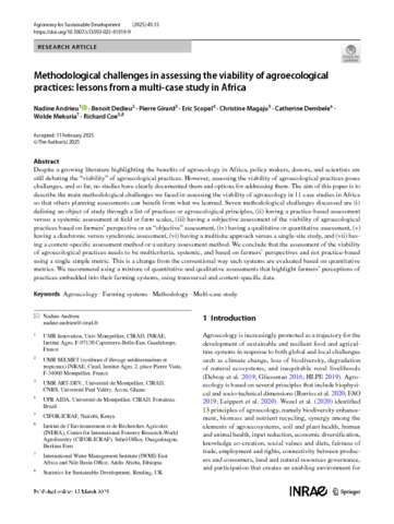 Andrieu Nadine, Dedieu Benoît, Girard Pierre, Scopel Eric, Magaju Christine, Dembele Catherine, Mekuria Wolde, Coe Richard. 2025. Methodological challenges in assessing the viability of agroecological practices: Lessons from a multi‑case study in Africa. Agronomy for Sustainable Development, 45:15, 18 p.