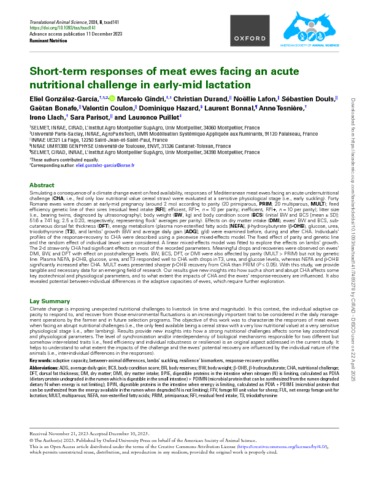 Gonzalez-Garcia Eliel, Gindri Marcelo, Durand Christian, Lafon Noëllie, Douls Sébastien, Bonafe Gaëtan, Coulon Valentin, Hazard Dominique, Bonnal Laurent, Tesnière Anne, Llach Irene, Parisot Sara, Puillet Laurence. 2023. Short-term responses of meat ewes facing an acute nutritional challenge in early-mid lactation. Translational Animal Science, 8:txad141, 13 p.