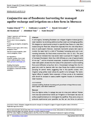 Khardi Yassine, Lacombe Guillaume, Dewandel Benoit, Hammani Ali, Taky Abdelilah, Bouarfa Sami. 2024. Conjunctive use of floodwater harvesting for managed aquifer recharge and irrigation on a date farm in Morocco. Irrigation and Drainage, 73 (4) : 1424-1436.