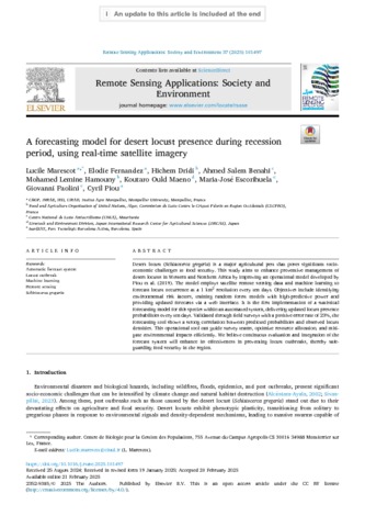 Marescot Lucile, Fernandez Élodie, Dridi Hichem, Benahi Ahmed Salem, Hamouny Mohamed Lemine, Maeno Koutaro Ould, Escorihuela Maria-José, Paolini Giovanni, Piou Cyril. 2025. A forecasting model for desert locust presence during recession period, using real-time satellite imagery. Remote Sensing Applications: Society and Environment, 37:101497, 17 p.