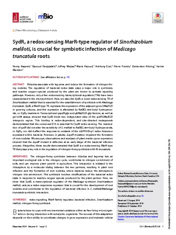 Nazaret Fanny, Farajzadeh Davoud, Mejias Joffrey, Pacoud Marie, Cosi Anthony, Frendo Pierre, Alloing Geneviève, Mandon Karine. 2024. SydR, a redox-sensing MarR-type regulator of Sinorhizobium meliloti, is crucial for symbiotic infection of Medicago truncatula roots. Mbio, 15 (12), 20 p.