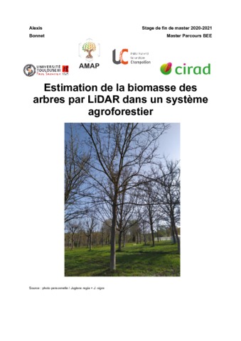 Bonnet Alexis. 2021. Estimation de la biomasse des arbres par LiDAR dans un système agroforestier. Toulouse : Université Toulouse III Paul Sabatier, 50 p.. Mémoire de master 2 : Université Toulouse 3 - Paul Sabatier