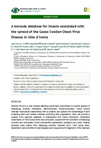 Koffi Alain Déron, Babin Régis, Delvare Gérard, Cherasse Sarah, Ouvrard David, Shimbori Eduardo Mitio, Koigny Kouadio Juslin, Kpangui Serge, Benoit Laure, Galan Maxime, Yodé Christine, Ouali N'Goran S-W. Mauricette, Haran Julien. 2025. A barcode database for insects associated with the spread of the Cocoa Swollen Shoot Virus Disease in Côte d'Ivoire. Biodiversity Data Journal, 13:e144017, 35 p.