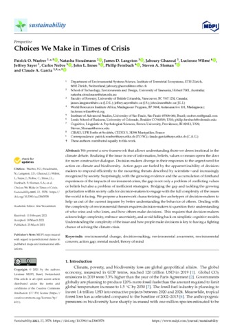 Waeber Patrick O., Stoudmann Natasha, Langston James D., Ghazoul Jaboury, Wilmé Lucienne, Sayer Jeffrey, Nobre Carlos, Innes John L., Fernbach Philip, Sloman Steven A., Garcia Claude. 2021. Choices we make in times of crisis. Sustainability, 13 (6):3578, 18 p.