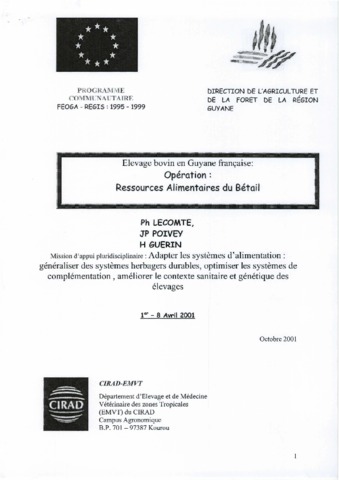 Lecomte Philippe, Poivey Jean-Paul, Guérin Hubert. 2001. Elevage bovin en Guyane française : Opération : Ressources alimentaires du bétail. Mission d'appui pluridisciplinaire du 1-8 avril 2001. Kourou : CIRAD-EMVT, 25 p.