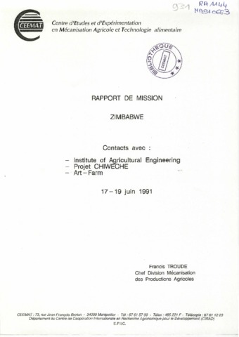 Troude Francis. 1991. Rapport de mission Zimbabwe. Contacts avec : lnstitute of Agricultural Eengineering - Projet Chiweche - Art-Farm. 17 - 19 juin 1991. Montpellier : CIRAD-CEEMAT, 15 p.