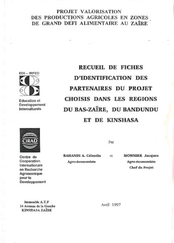 Bahandi Célestin, Monnier Jacques. 1997. Recueil de fiches d'identification des partenaires du projet choisis dans les régions du bas-zaïre, du Bandundu et de Kinshasa. Projet valorisation des productions agricoles en zones de grand défi alimentaire au Zaïre. s.l. : s.n., 136 p.