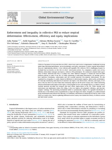 Naime Julia, Angelsen Arild, Molina-Garzón Adriana, Carrilho Cauê D., Selviana Vivi, Demarchi Gabriela, Duchelle Amy E., Martius Christopher. 2022. Enforcement and inequality in collective PES to reduce tropical deforestation: Effectiveness, efficiency and equity implications. Global Environmental Change, 74:102520, 13 p.