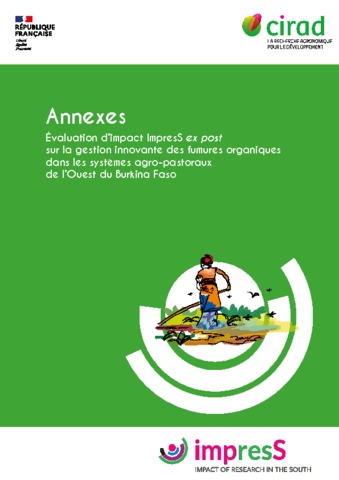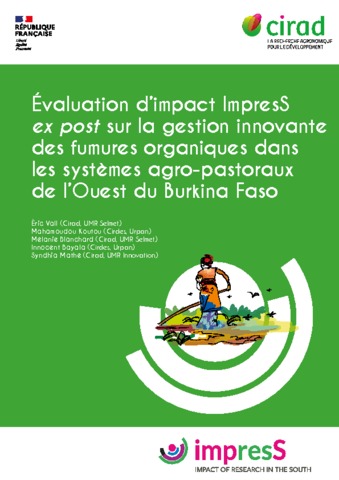 Vall Eric, Koutou Mahamoudou, Blanchard Melanie, Bayala Innocent, Mathe Syndhia. 2016. Évaluation d'impact ImpresS ex post sur la gestion innovante des fumures organiques dans les systèmes agro-pastoraux de l'Ouest du Burkina-Faso. Volume 1 : rapport, volume 2 : annexes. Montpellier : CIRAD, 2 vol. (47 p., 5 p.)