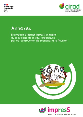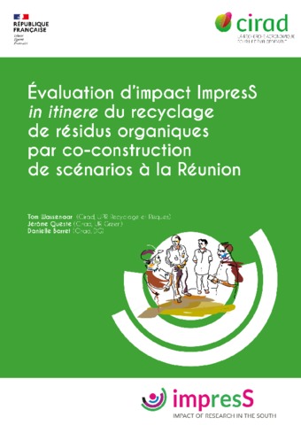 Wassenaar Tom, Queste Jérôme, Barret Danielle. 2016. Évaluation d'impact ImpresS in itinere du recyclage de résidus organiques par co-construction de scénarios à la Réunion. Volume 1 : rapport, volume 2 : annexes. Montpellier : CIRAD, 2 vol. (34 p., 13 p.)