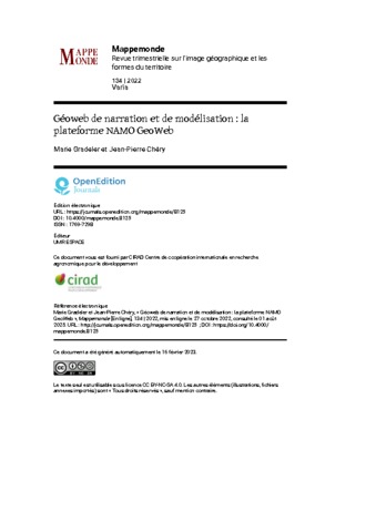 Gradeler Marie, Chéry Jean-Pierre. 2022. Géoweb de narration et de modélisation : la plateforme NAMO GeoWeb. Mappemonde (134), 13 p.