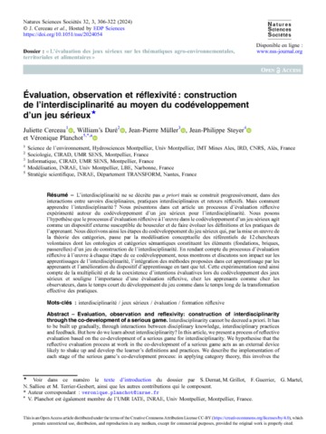 Cerceau Juliette, Daré William's, Müller Jean Pierre, Steyer Jean-Philippe, Planchot Véronique. 2024. Évaluation, observation et réflexivité : construction de l'interdisciplinarité au moyen du codéveloppement d'un jeu sérieux. Natures Sciences Sociétés, 32 (3), dossier « L’évaluation des jeux sérieux sur les thématiques agro-environnementales, territoriales et alimentaires » – Évaluation, observation et réflexivité : construction de l’interdisciplinarité au moyen du codéveloppement d’un jeu sérieux : 306-322.